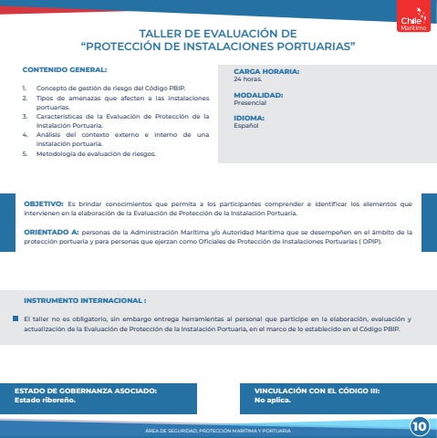 TALLER DE EVALUACI%u00d3N DE %u201cPROTECCI%u00d3N DE INSTALACIONES PORTUARIAS%u201dCONTENIDO GENERAL:1. Concepto de gesti%u00f3n de riesgo del C%u00f3digo PBIP.2. Tipos de amenazas que afecten a las instalaciones portuarias.3. Caracter%u00edsticas de la Evaluaci%u00f3n de Protecci%u00f3n de la Instalaci%u00f3n Portuaria.4. An%u00e1lisis del contexto externo e interno de una instalaci%u00f3n portuaria.5. Metodolog%u00eda de evaluaci%u00f3n de riesgos.OBJETIVO: Es brindar conocimientos que permita a los participantes comprender e identificar los elementos que intervienen en la elaboraci%u00f3n de la Evaluaci%u00f3n de Protecci%u00f3n de la Instalaci%u00f3n Portuaria.ORIENTADO A: personas de la Administraci%u00f3n Mar%u00edtima y/o Autoridad Mar%u00edtima que se desempe%u00f1en en el %u00e1mbito de la protecci%u00f3n portuaria y para personas que ejerzan como Oficiales de Protecci%u00f3n de Instalaciones Portuarias ( OPIP).%u00c1REA DE SEGURIDAD, PROTECCI%u00d3N MAR%u00cdTIMA Y PORTUARIACARGA HORARIA:24 horas.MODALIDAD:Presencial IDIOMA: Espa%u00f1olESTADO DE GOBERNANZA ASOCIADO:Estado ribere%u00f1o.VINCULACI%u00d3N CON EL C%u00d3DIGO III:No aplica.INSTRUMENTO INTERNACIONAL :El taller no es obligatorio, sin embargo entrega herramientas al personal que participe en la elaboraci%u00f3n, evaluaci%u00f3n y actualizaci%u00f3n de la Evaluaci%u00f3n de Protecci%u00f3n de la Instalaci%u00f3n Portuaria, en el marco de lo establecido en el C%u00f3digo PBIP.10