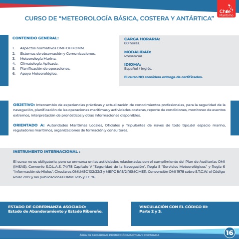 CURSO DE %u201cMETEOROLOG%u00cdA B%u00c1SICA, COSTERA Y ANT%u00c1RTICA%u201dCONTENIDO GENERAL:1. Aspectos normativos OMI+OHI+OMM.2. Sistemas de observaci%u00f3n y Comunicaciones.3. Meteorolog%u00eda Marina.4. Climatolog%u00eda Aplicada.5. Planificaci%u00f3n de operaciones.6. Apoyo Meteorol%u00f3gico.OBJETIVO: Intercambio de experiencias pr%u00e1cticas y actualizaci%u00f3n de conocimientos profesionales, para la seguridad de la navegaci%u00f3n, planificaci%u00f3n de las operaciones mar%u00edtimas y actividades costeras, reporte de condiciones, monitoreo de eventos extremos, interpretaci%u00f3n de pron%u00f3sticos y otras informaciones disponibles. ORIENTADO A: Autoridades Mar%u00edtimas Locales, Oficiales y Tripulantes de naves de todo tipo.del espacio marino, reguladores mar%u00edtimos, organizaciones de formaci%u00f3n y consultores.%u00c1REA DE SEGURIDAD, PROTECCI%u00d3N MAR%u00cdTIMA Y PORTUARIACARGA HORARIA:80 horas.MODALIDAD:Presencial.IDIOMA: Espa%u00f1ol / Ingl%u00e9s.El curso NO considera entrega de certificados.ESTADO DE GOBERNANZA ASOCIADO:Estado de Abanderamiento y Estado Ribere%u00f1o.VINCULACI%u00d3N CON EL C%u00d3DIGO III:Parte 2 y 3. INSTRUMENTO INTERNACIONAL :El curso no es obligatorio, pero se enmarca en las actividades relacionadas con el cumplimiento del Plan de Auditor%u00edas OMI (IMSAS): Convenio S.O.L.A.S. 74/78 Cap%u00edtulo V \ol%u00f3gicos\\ de Hielos\l C%u00f3digo Polar 2017 y las publicaciones OMM 1205 y EC 76.16