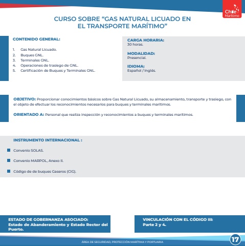 CURSO SOBRE %u201cGAS NATURAL LICUADO EN EL TRANSPORTE MAR%u00cdTIMO%u201dCONTENIDO GENERAL:1. Gas Natural Licuado.2. Buques GNL.3. Terminales GNL.4. Operaciones de trasiego de GNL.5. Certificaci%u00f3n de Buques y Terminales GNL.OBJETIVO: Proporcionar conocimientos b%u00e1sicos sobre Gas Natural Licuado, su almacenamiento, transporte y trasiego, con el objeto de efectuar los reconocimientos necesarios para buques y terminales mar%u00edtimos.ORIENTADO A: Personal que realiza inspecci%u00f3n y reconocimientos a buques y terminales mar%u00edtimos.%u00c1REA DE SEGURIDAD, PROTECCI%u00d3N MAR%u00cdTIMA Y PORTUARIACARGA HORARIA:30 horas.MODALIDAD:Presencial.IDIOMA: Espa%u00f1ol / Ingl%u00e9s.ESTADO DE GOBERNANZA ASOCIADO:Estado de Abanderamiento y Estado Rector del Puerto.VINCULACI%u00d3N CON EL C%u00d3DIGO III:Parte 2 y 4.INSTRUMENTO INTERNACIONAL :Convenio SOLAS.Convenio MARPOL, Anexo II.C%u00f3digo de de buques Gaseros (CIG).17
