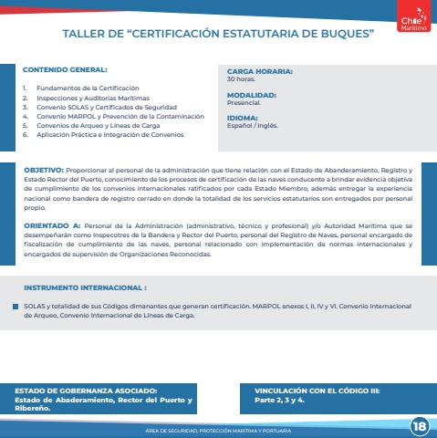 TALLER DE %u201cCERTIFICACI%u00d3N ESTATUTARIA DE BUQUES%u201dCONTENIDO GENERAL:1. Fundamentos de la Certificaci%u00f3n2. Inspecciones y Auditor%u00edas Mar%u00edtimas3. Convenio SOLAS y Certificados de Seguridad4. Convenio MARPOL y Prevenci%u00f3n de la Contaminaci%u00f3n5. Convenios de Arqueo y L%u00edneas de Carga6. Aplicaci%u00f3n Pr%u00e1ctica e Integraci%u00f3n de ConveniosOBJETIVO: Proporcionar al personal de la administraci%u00f3n que tiene relaci%u00f3n con el Estado de Abanderamiento, Registro y Estado Rector del Puerto, conocimiento de los procesos de certificaci%u00f3n de las naves conducente a brindar evidencia objetiva de cumplimiento de los convenios internacionales ratificados por cada Estado Miembro, adem%u00e1s entregar la experiencia nacional como bandera de registro cerrado en donde la totalidad de los servicios estatutarios son entregados por personal propio. ORIENTADO A: Personal de la Administraci%u00f3n (administrativo, t%u00e9cnico y profesional) y/o Autoridad Mar%u00edtima que se desempe%u00f1ar%u00e1n como Inspecotres de la Bandera y Rector del Puerto, personal del Registro de Naves, personal encargado de fiscalizaci%u00f3n de cumplimiento de las naves, personal relacionado con implementaci%u00f3n de normas internacionales y encargados de supervisi%u00f3n de Organizaciones Reconocidas. %u00c1REA DE SEGURIDAD, PROTECCI%u00d3N MAR%u00cdTIMA Y PORTUARIACARGA HORARIA:30 horas.MODALIDAD:Presencial.IDIOMA: Espa%u00f1ol / Ingl%u00e9s.ESTADO DE GOBERNANZA ASOCIADO:Estado de Abaderamiento, Rector del Puerto y Ribere%u00f1o.VINCULACI%u00d3N CON EL C%u00d3DIGO III:Parte 2, 3 y 4.INSTRUMENTO INTERNACIONAL :SOLAS y totalidad de sus C%u00f3digos dimanantes que generan certificaci%u00f3n. MARPOL anexos I, II, IV y VI. Convenio Internacional de Arqueo, Convenio Internacional de L%u00edneas de Carga.18