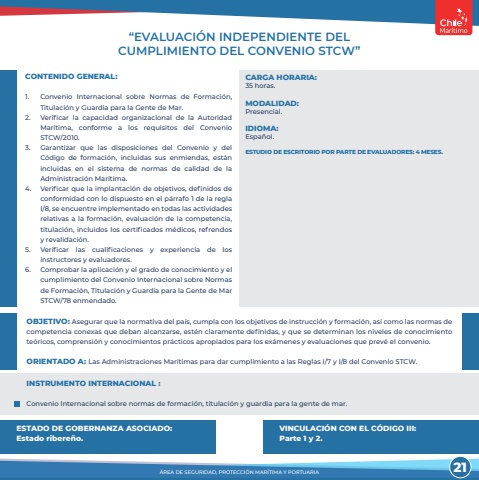 CARGA HORARIA:35 horas. MODALIDAD:Presencial.IDIOMA: Espa%u00f1ol.ESTUDIO DE ESCRITORIO POR PARTE DE EVALUADORES: 4 MESES.%u201cEVALUACI%u00d3N INDEPENDIENTE DEL CUMPLIMIENTO DEL CONVENIO STCW%u201dCONTENIDO GENERAL:1. Convenio Internacional sobre Normas de Formaci%u00f3n, Titulaci%u00f3n y Guardia para la Gente de Mar.2. Verificar la capacidad organizacional de la Autoridad Mar%u00edtima, conforme a los requisitos del Convenio STCW/2010.3. Garantizar que las disposiciones del Convenio y del C%u00f3digo de formaci%u00f3n, incluidas sus enmiendas, est%u00e1n incluidas en el sistema de normas de calidad de la Administraci%u00f3n Mar%u00edtima.4. Verificar que la implantaci%u00f3n de objetivos, definidos de conformidad con lo dispuesto en el p%u00e1rrafo 1 de la regla I/8, se encuentre implementado en todas las actividades relativas a la formaci%u00f3n, evaluaci%u00f3n de la competencia, titulaci%u00f3n, incluidos los certificados m%u00e9dicos, refrendos y revalidaci%u00f3n.5. Verificar las cualificaciones y experiencia de los instructores y evaluadores.6. Comprobar la aplicaci%u00f3n y el grado de conocimiento y el cumplimiento del Convenio Internacional sobre Normas de Formaci%u00f3n, Titulaci%u00f3n y Guardia para la Gente de Mar STCW/78 enmendado.OBJETIVO: Asegurar que la normativa del pa%u00eds, cumpla con los objetivos de instrucci%u00f3n y formaci%u00f3n, as%u00ed como las normas de competencia conexas que deban alcanzarse, est%u00e9n claramente definidas, y que se determinan los niveles de conocimiento te%u00f3ricos, comprensi%u00f3n y conocimientos pr%u00e1cticos apropiados para los ex%u00e1menes y evaluaciones que prev%u00e9 el convenio.ORIENTADO A: Las Administraciones Mar%u00edtimas para dar cumplimiento a las Reglas I/7 y I/8 del Convenio STCW.%u00c1REA DE SEGURIDAD, PROTECCI%u00d3N MAR%u00cdTIMA Y PORTUARIAESTADO DE GOBERNANZA ASOCIADO:Estado ribere%u00f1o.VINCULACI%u00d3N CON EL C%u00d3DIGO III:Parte 1 y 2.INSTRUMENTO INTERNACIONAL :Convenio Internacional sobre normas de formaci%u00f3n, titulaci%u00f3n y guardia para la gente de mar.21