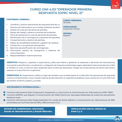 CURSO OMI 4.03 %u201cOPERADOR PRIMERA RESPUESTA (OPRC NIVEL 2)%u201dCONTENIDO GENERAL:1. Coordinar y evaluar operaciones de respuesta ante de un derrame de hidrocarburo en el medio ambiente acu%u00e1tico.2. Gesti%u00f3n de crisis por derrames de petr%u00f3leo.3. Equipo de trabajo y sistema comando de incidentes.4. Toma de decisiones en caso de derrames de petr%u00f3leo.5. Planificaci%u00f3n de la contingencia y opciones de respuesta.6. Comportamiento y destino del petr%u00f3leo.7. Mapeo de sensibilidad ambiental u gesti%u00f3n de residuos.8. Contenci%u00f3n y recuperaci%u00f3n del petr%u00f3leo 9. Ejercicios de planificaci%u00f3n de contingencias. 10. Informaci%u00f3n p%u00fablica de emergencia y sistemas de comunicaciones.11. Responsabilidad e indemnizaciones.OBJETIVO: Preparar y capacitar a supervisores y jefes para liderar y gestionar la respuesta a derrames de hidrocarburos, incluyendo la planificaci%u00f3n, coordinaci%u00f3n y mitigaci%u00f3n de impactos ambientales seg%u00fan est%u00e1ndares internacionales de la OMI, al finalizar el curso, el alumno estar preparado para la toma de decisiones, mitigar las consecuencias de dichos derrames y asesorar en buena forma a la gerencia.ORIENTADO A: Supervisores o jefes en lugar del siniestro que se desempe%u00f1a en la direcci%u00f3n de operaciones de respuesta contra la contaminaci%u00f3n o que cumplen labores de alta direcci%u00f3n en organismos p%u00fablicos y que cuenta con el curso OMI 4.02, del %u00e1mbito mar%u00edtimo, p%u00fablico y privado.%u00c1REA DE CONTROL Y COMBATE DE LA CONTAMINACI%u00d3N ACU%u00c1TICAESTADO DE GOBERNANZA ASOCIADO:Estado de Abanderamiento y Estado Ribere%u00f1o.VINCULACI%u00d3N CON EL C%u00d3DIGO III:Parte 2 y 3.INSTRUMENTO INTERNACIONAL :Convenio Internacional Sobre Cooperaci%u00f3n, Preparaci%u00f3n y Lucha Contra la Contaminaci%u00f3n por Hidrocarburos (OPRC 1990)%u201d.Convenio MARPOL que Regular la Contaminaci%u00f3n del Medio Marino por descargas deliberadas de sustancias perjudiciales desde las naves.Convenio Internacional sobre Responsabilidad Civil nacida de Da%u00f1os Debidos a Contaminaci%u00f3n por Hidrocarburos de 1969, enmendado por los Protocolos de 1976 y 1992 (Convenio CLC).CARGA HORARIA:35 horas. MODALIDAD:Presencial / Online.IDIOMA: Espa%u00f1ol.24