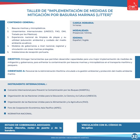 TALLER DE %u201cIMPLEMENTACI%u00d3N DE MEDIDAS DE MITIGACI%u00d3N POR BASURAS MARINAS (LITTER)%u201dCONTENIDO GENERAL:1. Basuras marinas y micropl%u00e1sticos.2. Lineamientos internacionales (UNESCO, FAO, OMI, Tratado por los Pl%u00e1sticos).3. Experiencia nacional de limpieza de playas y su utilidad (educaci%u00f3n ambiental y cuidado del medio ambiente acu%u00e1tico).4. Modelos de gobernanza a nivel nacional, regional y vinculaci%u00f3n con %u00e1reas marinas protegidas.5. Instalaciones de recepci%u00f3n portuaria.OBJETIVO: Entregar herramientas que permitan desarrollar capacidades para una mejor implementaci%u00f3n de medidas de mitigaci%u00f3n y gobernanza, para enfrentar la contaminaci%u00f3n por basuras marinas y micropl%u00e1sticos en el transporte mar%u00edtimo y pesquero.ORIENTADO A: Personal de la Administraci%u00f3n Mar%u00edtima vinculado a la gesti%u00f3n ambiental y protecci%u00f3n del medio ambiente marino.%u00c1REA DE GESTI%u00d3N Y MEDIOAMBIENTE MAR%u00cdTIMOCARGA HORARIA:14 horas.MODALIDAD:Presencial / Online.IDIOMA: Espa%u00f1ol / Ingl%u00e9s ESTADO DE GOBERNANZA ASOCIADO:Estado ribere%u00f1o, rector de puerto y de la bandera.VINCULACI%u00d3N CON EL C%u00d3DIGO III:No aplicaINSTRUMENTO INTERNACIONAL :Convenio Internacional para Prevenir la Contaminaci%u00f3n por los Buques (MARPOL).Organizaci%u00f3n de las Naciones Unidas para la Educaci%u00f3n, la Ciencia y la Cultura (UNESCO).Organizaci%u00f3n de las Naciones Unidas para la Alimentaci%u00f3n y la Agricultura (FAO).Foro de Cooperaci%u00f3n Econ%u00f3mica Asia Pac%u00edfico (APEC).NORMATIVA NACIONAL.32