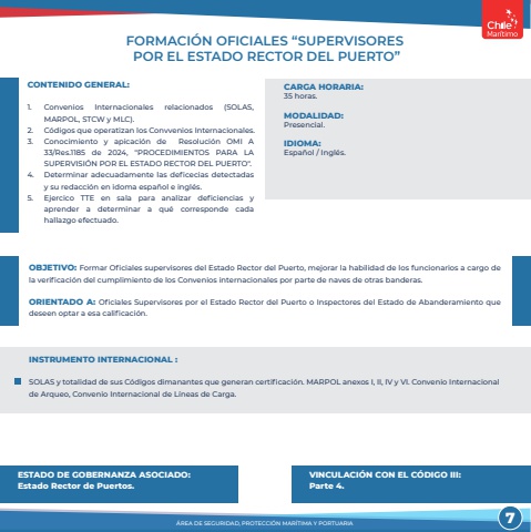 FORMACI%u00d3N OFICIALES %u201cSUPERVISORES POR EL ESTADO RECTOR DEL PUERTO%u201dCONTENIDO GENERAL:1. Convenios Internacionales relacionados (SOLAS, MARPOL, STCW y MLC).2. C%u00f3digos que operatizan los Convvenios Internacionales.3. Conocimiento y apicaci%u00f3n de Resoluci%u00f3n OMI A 33/Res.1185 de 2024, \SUPERVISI%u00d3N POR EL ESTADO RECTOR DEL PUERTO\4. Determinar adecuadamente las deficecias detectadas y su redacci%u00f3n en idoma espa%u00f1ol e ingl%u00e9s.5. Ejercico TTE en sala para analizar deficiencias y aprender a determinar a qu%u00e9 corresponde cada hallazgo efectuado.OBJETIVO: Formar Oficiales supervisores del Estado Rector del Puerto, mejorar la habilidad de los funcionarios a cargo de la verificaci%u00f3n del cumplimiento de los Convenios internacionales por parte de naves de otras banderas.ORIENTADO A: Oficiales Supervisores por el Estado Rector del Puerto o Inspectores del Estado de Abanderamiento que deseen optar a esa calificaci%u00f3n.%u00c1REA DE SEGURIDAD, PROTECCI%u00d3N MAR%u00cdTIMA Y PORTUARIACARGA HORARIA:35 horas.MODALIDAD:Presencial.IDIOMA: Espa%u00f1ol / Ingl%u00e9s.ESTADO DE GOBERNANZA ASOCIADO:Estado Rector de Puertos.VINCULACI%u00d3N CON EL C%u00d3DIGO III:Parte 4.INSTRUMENTO INTERNACIONAL :SOLAS y totalidad de sus C%u00f3digos dimanantes que generan certificaci%u00f3n. MARPOL anexos I, II, IV y VI. Convenio Internacional de Arqueo, Convenio Internacional de L%u00edneas de Carga.7