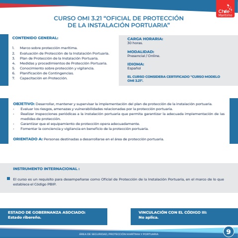 CURSO OMI 3.21 %u201cOFICIAL DE PROTECCI%u00d3N DE LA INSTALACI%u00d3N PORTUARIA%u201dCONTENIDO GENERAL:1. Marco sobre protecci%u00f3n mar%u00edtima.2. Evaluaci%u00f3n de Protecci%u00f3n de la Instalaci%u00f3n Portuaria.3. Plan de Protecci%u00f3n de la Instalaci%u00f3n Portuaria.4. Medidas y procedimientos de Protecci%u00f3n Portuaria.5. Conocimiento sobre protecci%u00f3n y vigilancia.6. Planificaci%u00f3n de Contingencias.7. Capacitaci%u00f3n en Protecci%u00f3n.OBJETIVO: Desarrollar, mantener y supervisar la implementaci%u00f3n del plan de protecci%u00f3n de la instalaci%u00f3n portuaria.%u2022 Evaluar los riesgos, amenazas y vulnerabilidades relacionadas por la protecci%u00f3n portuaria.%u2022 Realizar inspecciones peri%u00f3dicas a la instalaci%u00f3n portuaria que permita garantizar la adecuada implementaci%u00f3n de las medidas de protecci%u00f3n.%u2022 Garantizar que el equipamiento de protecci%u00f3n opera adecuadamente.%u2022 Fomentar la conciencia y vigilancia en beneficio de la protecci%u00f3n portuaria. ORIENTADO A: Personas destinadas a desarrollarse en el %u00e1rea de protecci%u00f3n portuaria.%u00c1REA DE SEGURIDAD, PROTECCI%u00d3N MAR%u00cdTIMA Y PORTUARIACARGA HORARIA:30 horas.MODALIDAD:Presencial / Online.IDIOMA: Espa%u00f1olEL CURSO CONSIDERA CERTIFICADO \OMI 3.21\ESTADO DE GOBERNANZA ASOCIADO:Estado ribere%u00f1o.VINCULACI%u00d3N CON EL C%u00d3DIGO III:No aplica.INSTRUMENTO INTERNACIONAL :El curso es un requisito para desempe%u00f1arse como Oficial de Protecci%u00f3n de la Instalaci%u00f3n Portuaria, en el marco de lo que establece el C%u00f3digo PBIP.9